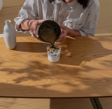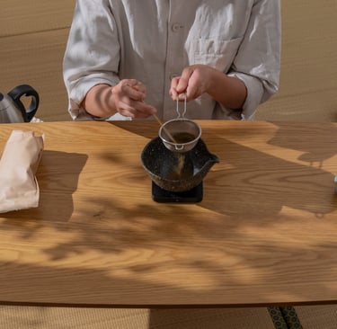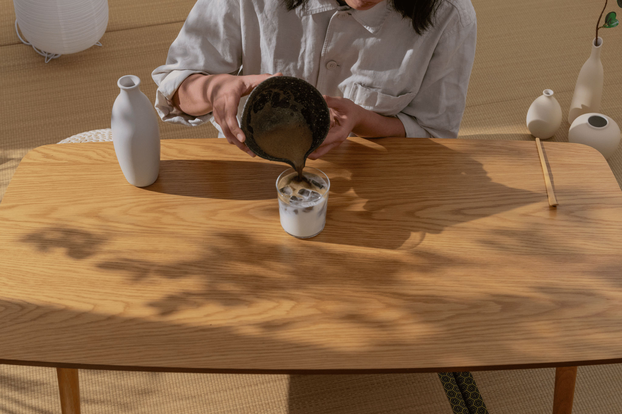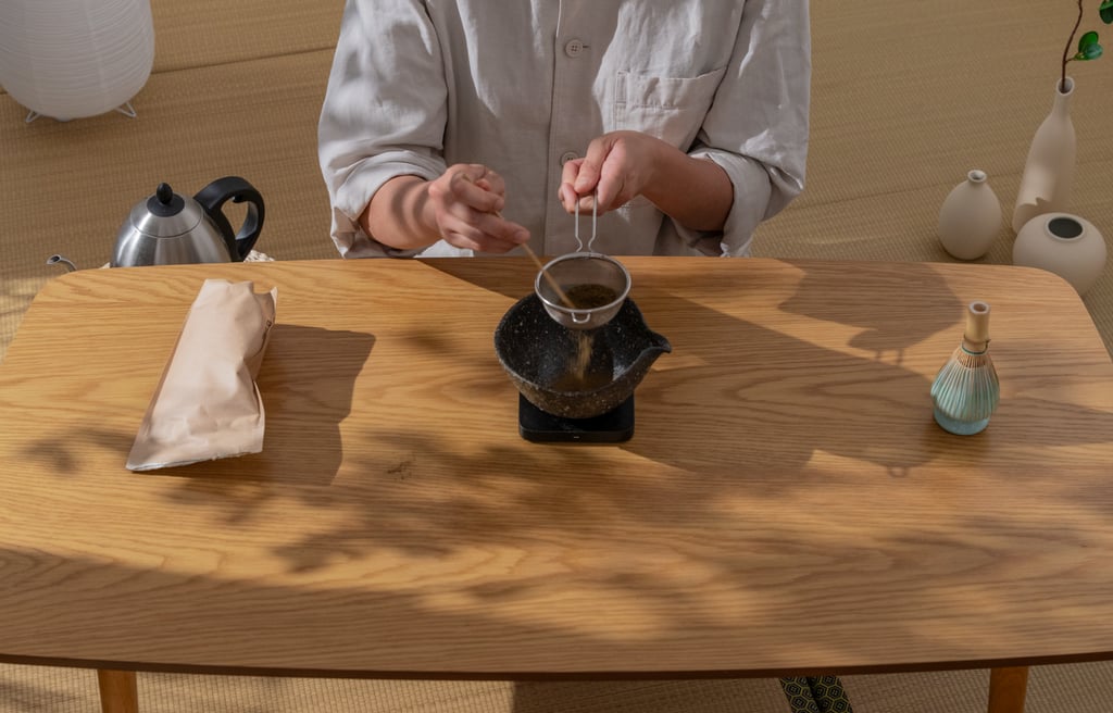 Dose 4g of hojicha powder into sifter over vessel of choice.